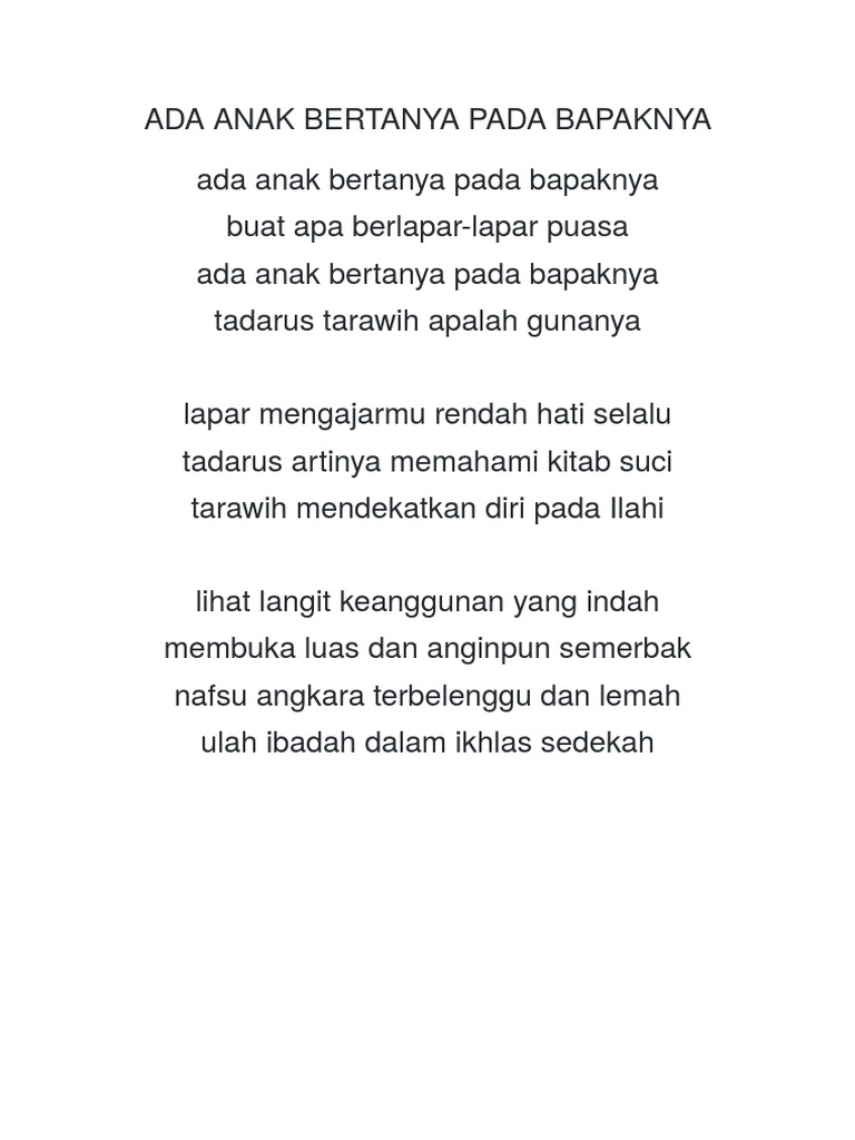 | Judul Surah: Lirik Lagu Ada Anak Bertanya Pada Bapaknya Lirik Lagu Dunia Lapar mengajarmu rendah hati selalu tadarus artinya memahami kitab suci tarawih mendekatkan diri pada. |